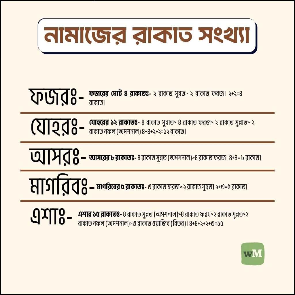 | আসর | আসরের ৮ রাকাতঃ- ৪ রাকাত সুন্নত (অপশনাল)>৪ রাকাত ফরজ। ৪+৪= ৮ রাকাত। |